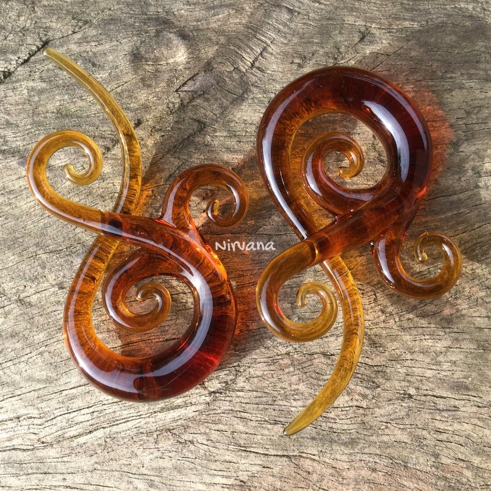 ITEM: This sale is for 1 pair (2 pieces) of hand made pyrex glass Amber Bonita Ear Spirals.