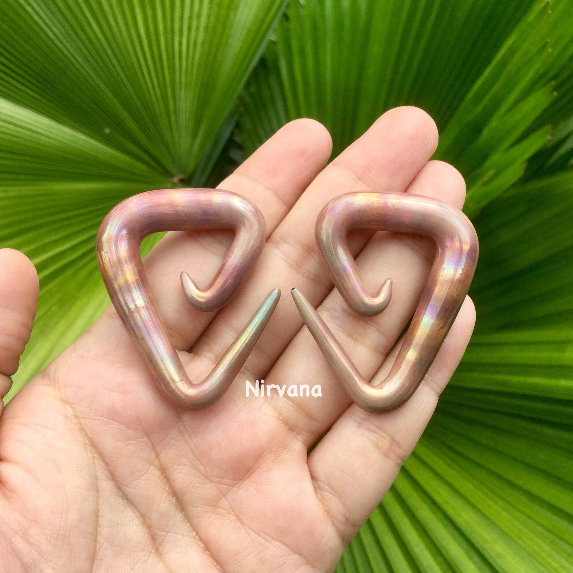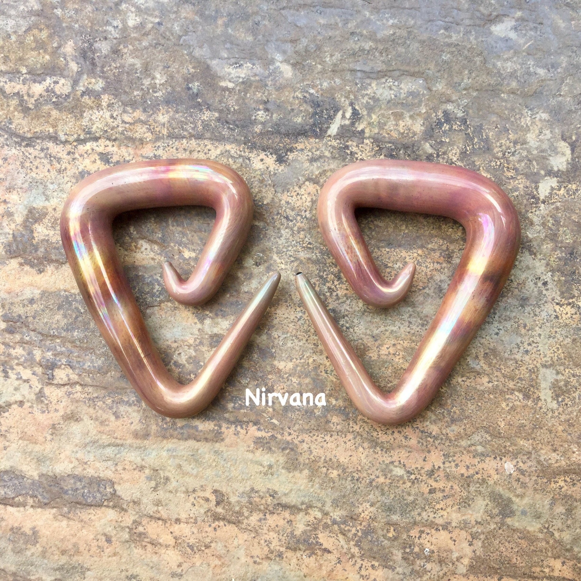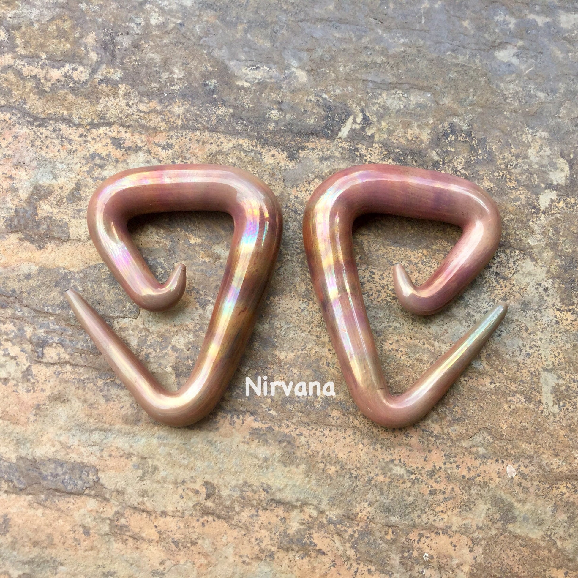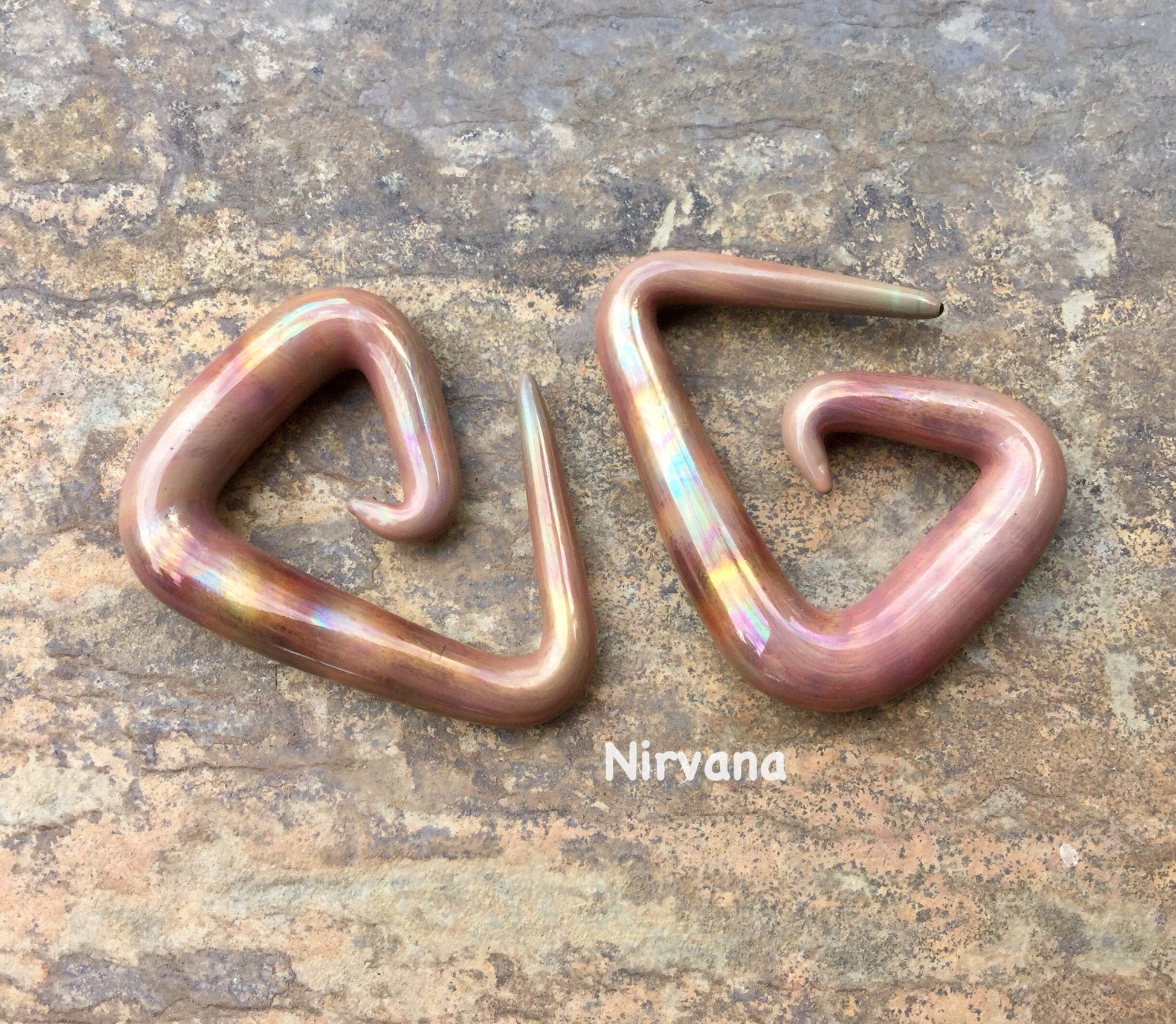 ITEM: This sale is for 1 pair (2 pieces) of hand made pyrex glass Antique Metallic Earth Color Triangle Shaped Ear Spirals.