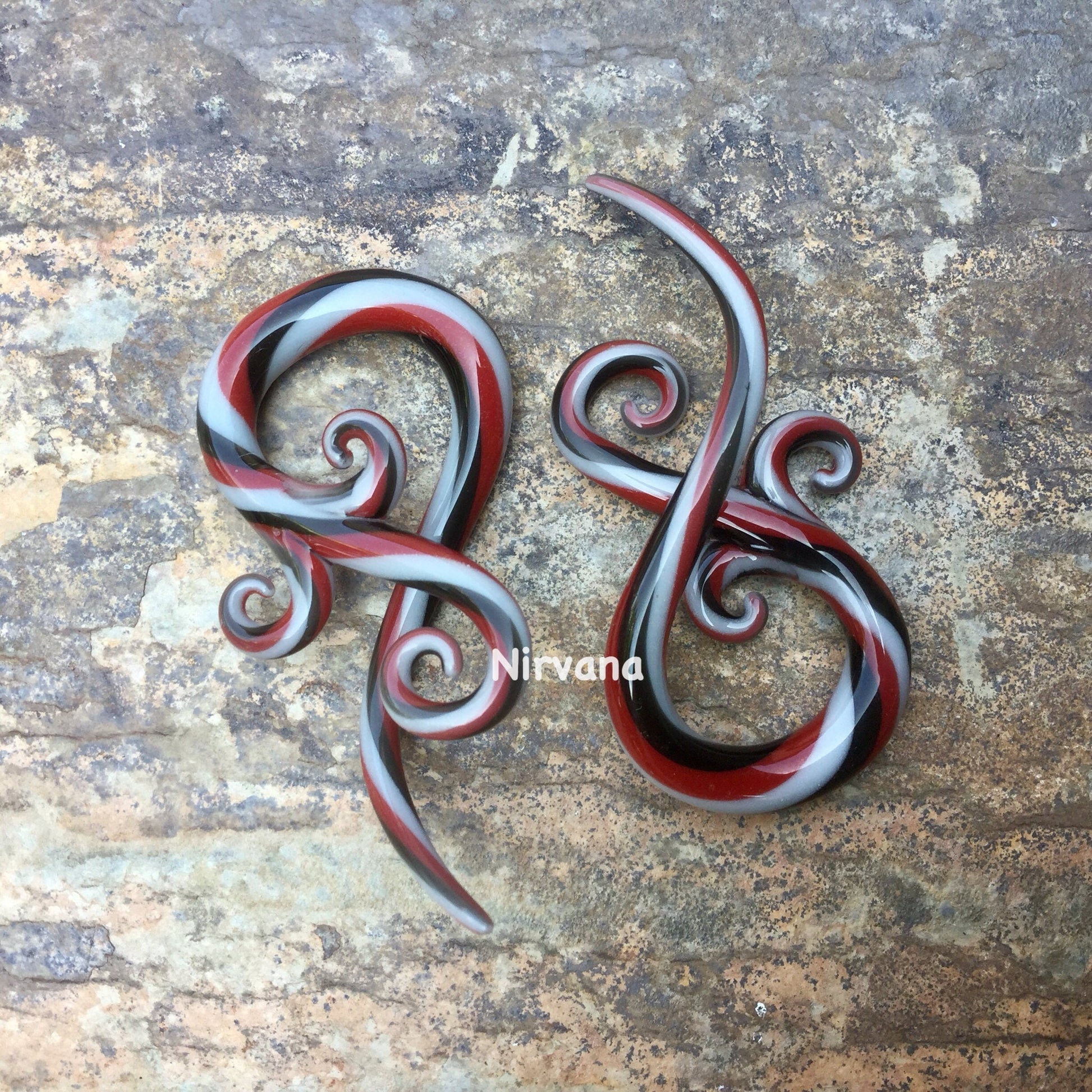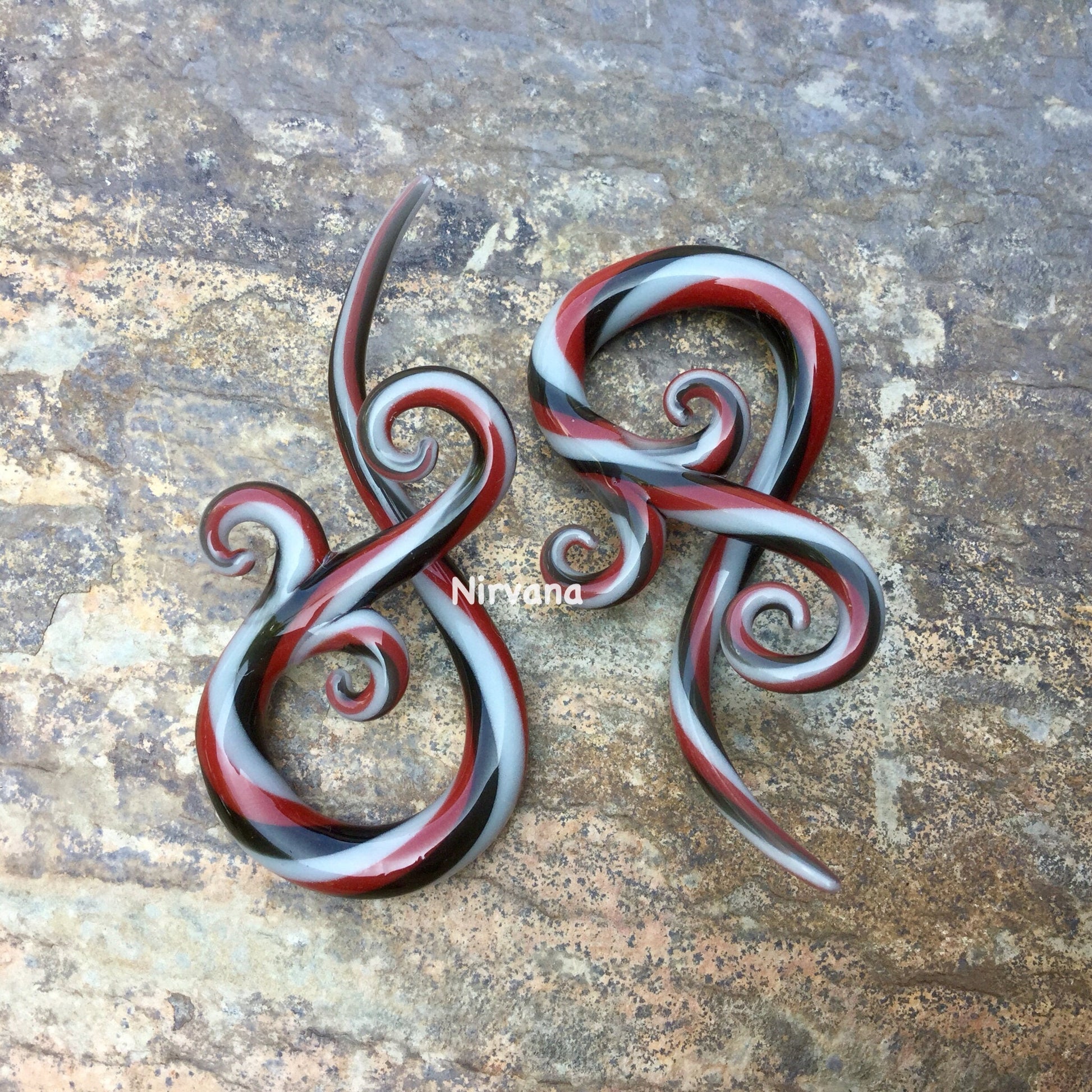 ITEM: This sale is for 1 pair (2 pieces) of our hand made pyrex glass Black, Light Gray & Burgundy Twist Style Pattern Bonita Spirals.