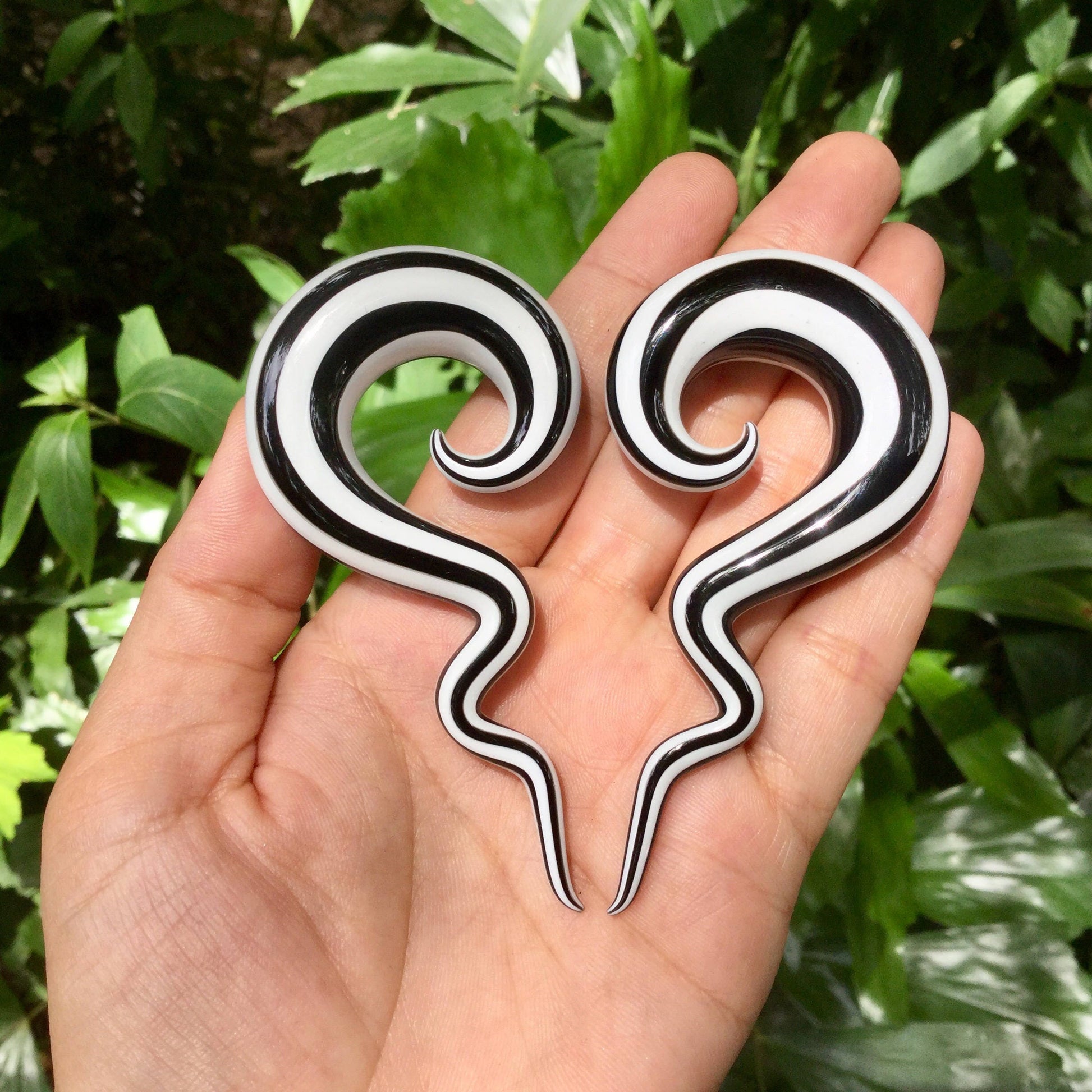 ITEM: This sale is for 1 pair (2 pieces) of our Pyrex glass hand made Spiral Drops in the Black & White Parallels Stripes Pattern.