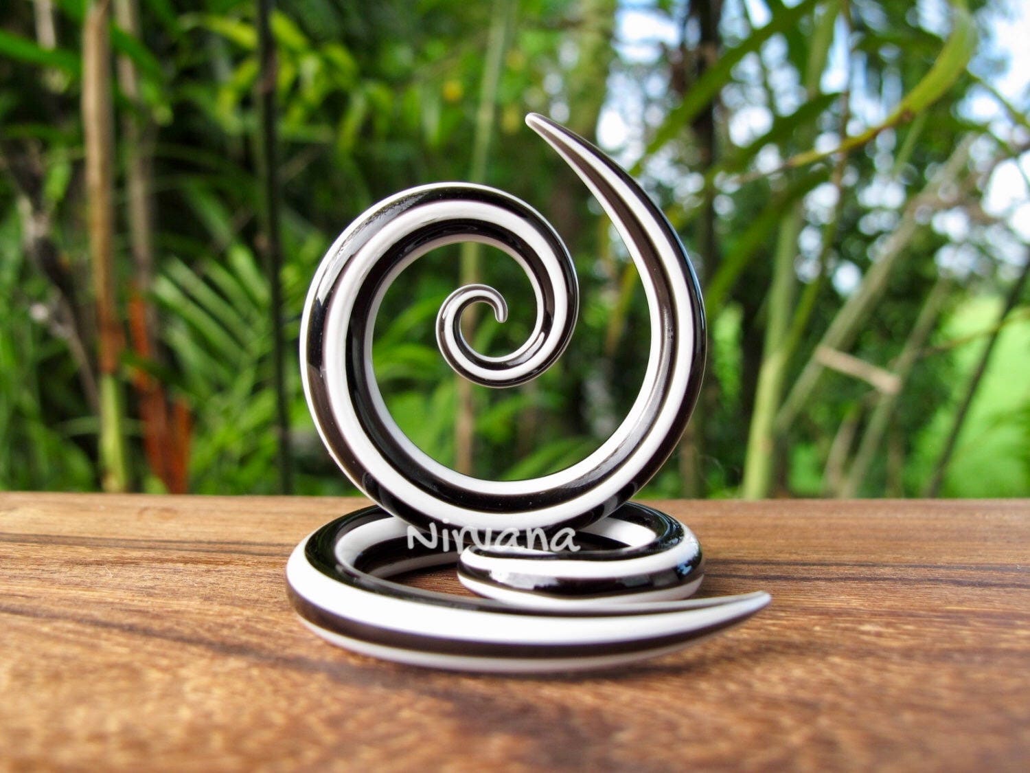ITEM: This sale is for 1 pair (2 pieces) of our Pyrex glass hand made Super Spirals in the Black & White Parallels Stripes Pattern.