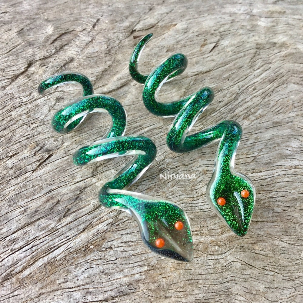 ITEM: This sale is for 1 pair (2 pieces) of hand made pyrex Emerald Green Dichroic Glass Snake Spirals.