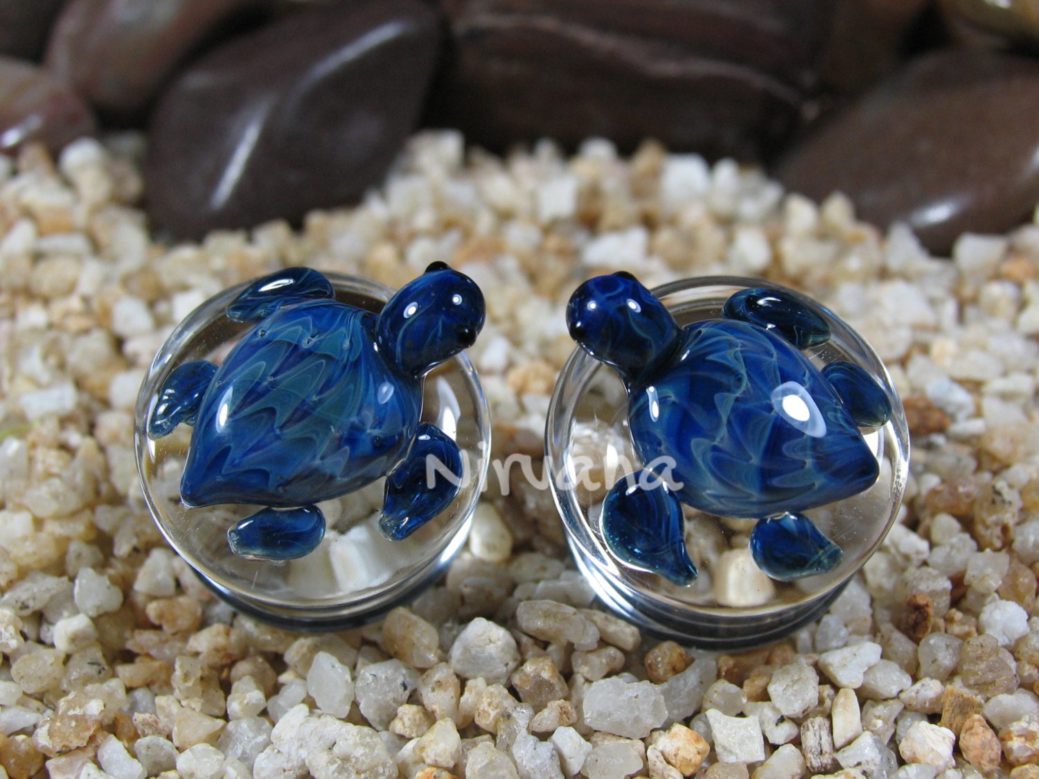 ITEM: This sale is for 1 pair (2 pieces) of hand made pyrex Glass Turtle Plugs in Exotic Blue.