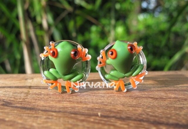 ITEM: This sale is for 1 pair (2 pieces) of hand made Pyrex Glass Green Poison Tree Frog with Orange Legs Plugs.