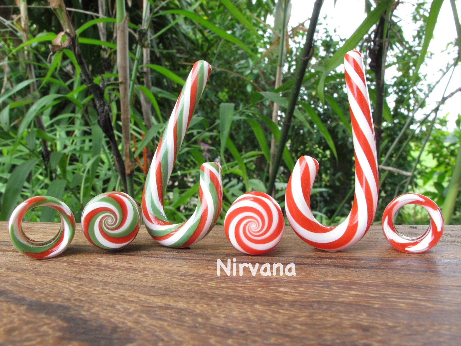 This sale is for 1 pair (2 pieces) of hand made to order Pyrex Glass Candy Twist Plugs in Red/Green/White Peppermint Stripes for the holidays.