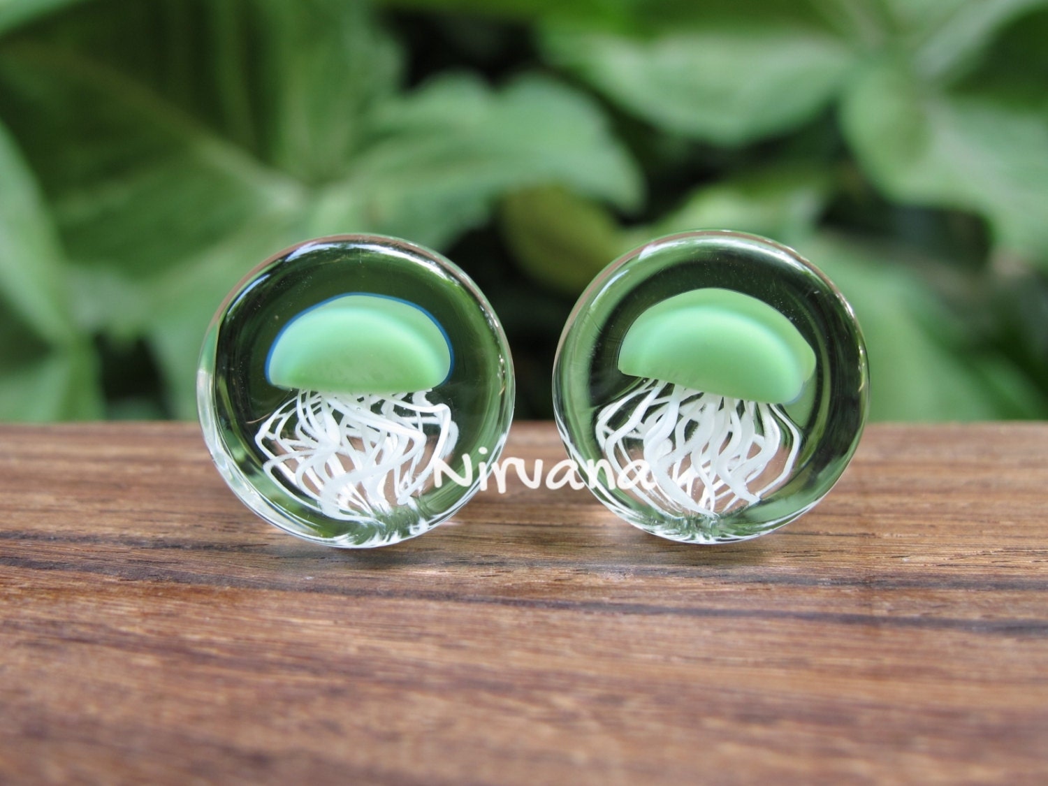 ITEM: This sale is for 1 pair (2 pieces) of hand made Jade Pyrex Glass Jellyfish Plugs with a Clear Background Color.