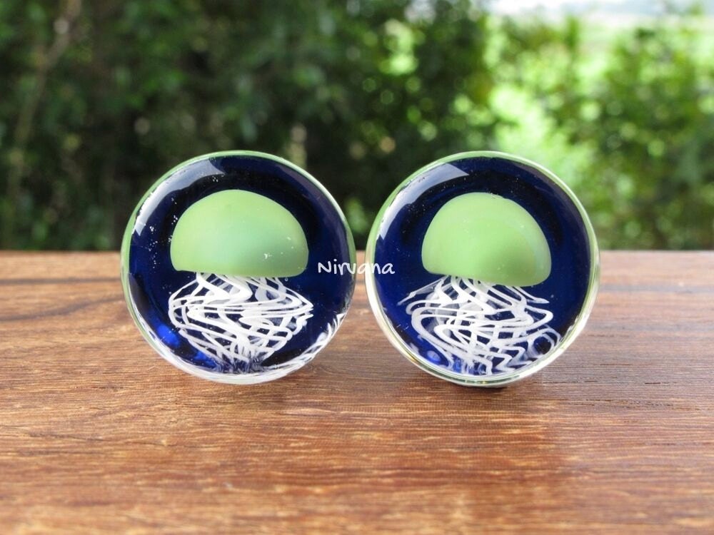 ITEM: This sale is for 1 pair (2 pieces) of hand made Jade Pyrex Glass Jellyfish Plugs with a Cobalt Blue Background Color.