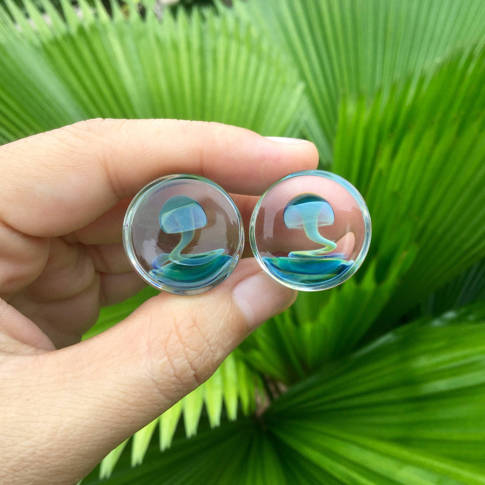 ITEM: This sale is for 1 pair (2 pieces) of hand made pyrex Glass Magic Mushroom Plugs in Exotic Blue.