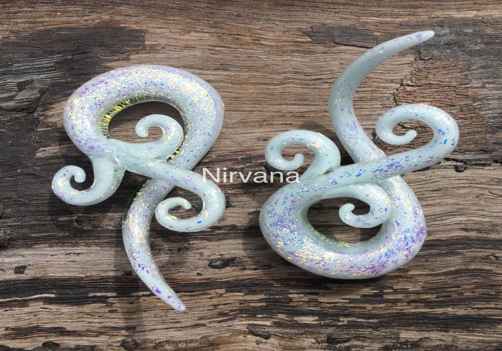 And of course if the photo listings are usually for a larger size please also understand that a smaller size ordered will look different too. This is important as you can't expect a 10g (2.5 mm) spirals to show as much color, design & pattern as a 0g (8 mm) or even 00g (10 mm) spirals. As 10g (2.5 mm) is only the size of about a strand of spaghetti pasta. Especially with the Dichroic colors or multi color requests they just won't work well in very small sizes as there's not enough space to put the colors in or for showing clearly.
