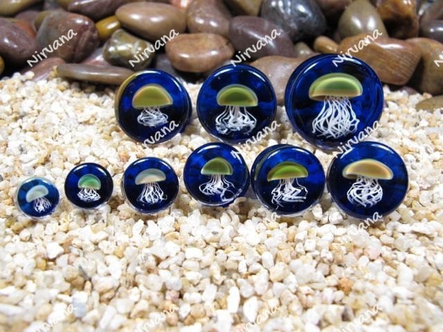 ITEM: This sale is for 1 pair (2 pieces) of hand made pyrex Jellyfish Plugs with a Jade Green Background Color.