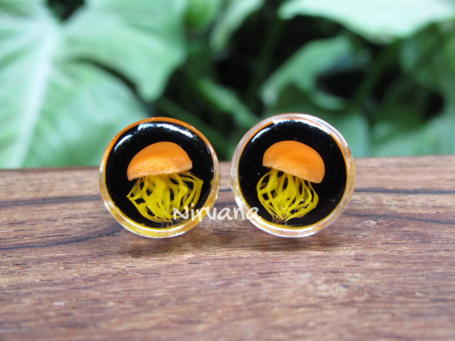 ITEM: This sale is for 1 pair (2 pieces) of hand made pyrex glass Orange Jellyfish Plugs with a Black Background Color and Dark Yellow Legs.