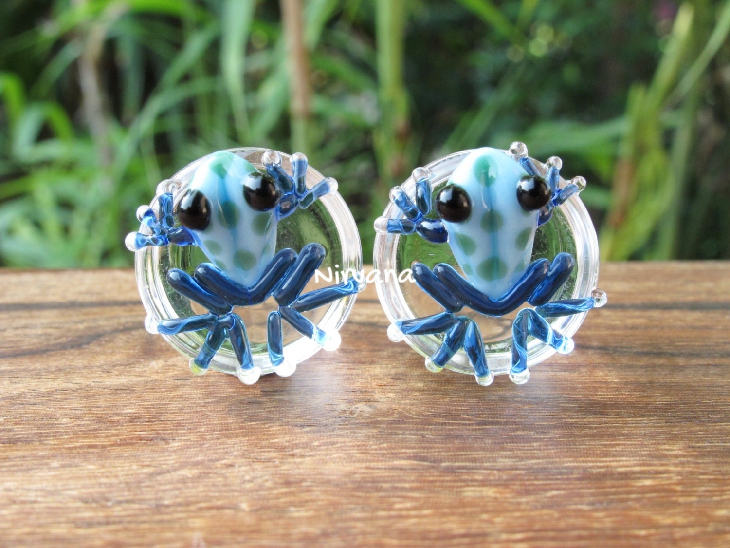 ITEM: This sale is for 1 pair (2 pieces) of hand made pyrex Glass Sky Blue Frog Plugs with Blue legs & Green Spots.