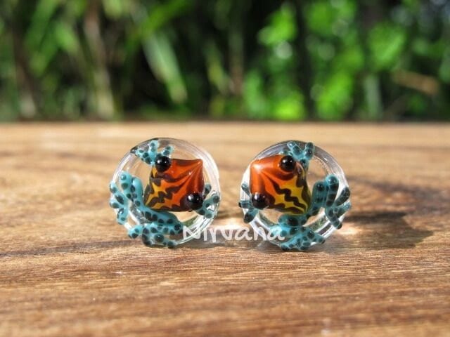 ITEM: This sale is for 1 pair (2 pieces) of hand made Pyrex Glass Sunburst Poison Tree Frog Plugs.