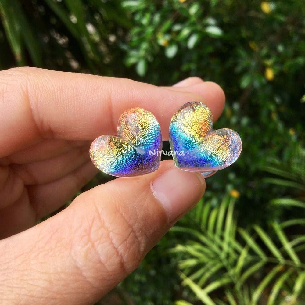 1 Pair (2 Pieces) Translucent Aquatic Rainbow Dichroic Glass Heart Plugs