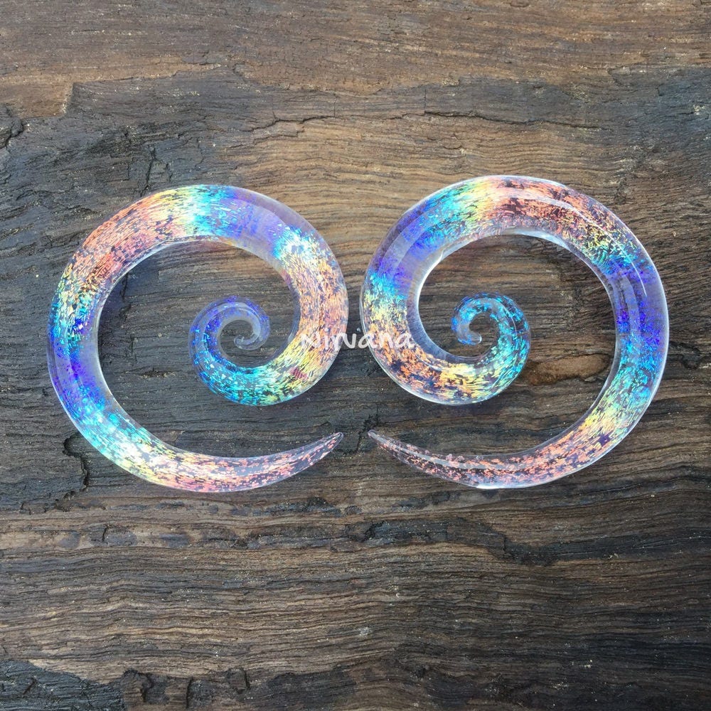 And of course if the photo listings are usually for a larger size please also understand that a smaller size ordered will look different too. This is important as you can't expect a 10g (2.5 mm) spirals to show as much color, design & pattern as a 0g (8 mm) or even 00g (10 mm) spirals. As 10g (2.5 mm) is only the size of about a strand of spaghetti pasta. Especially with the Dichroic colors or multi color requests they just won't work well in very small sizes as there's not enough space to put the colors in or for showing clearly.